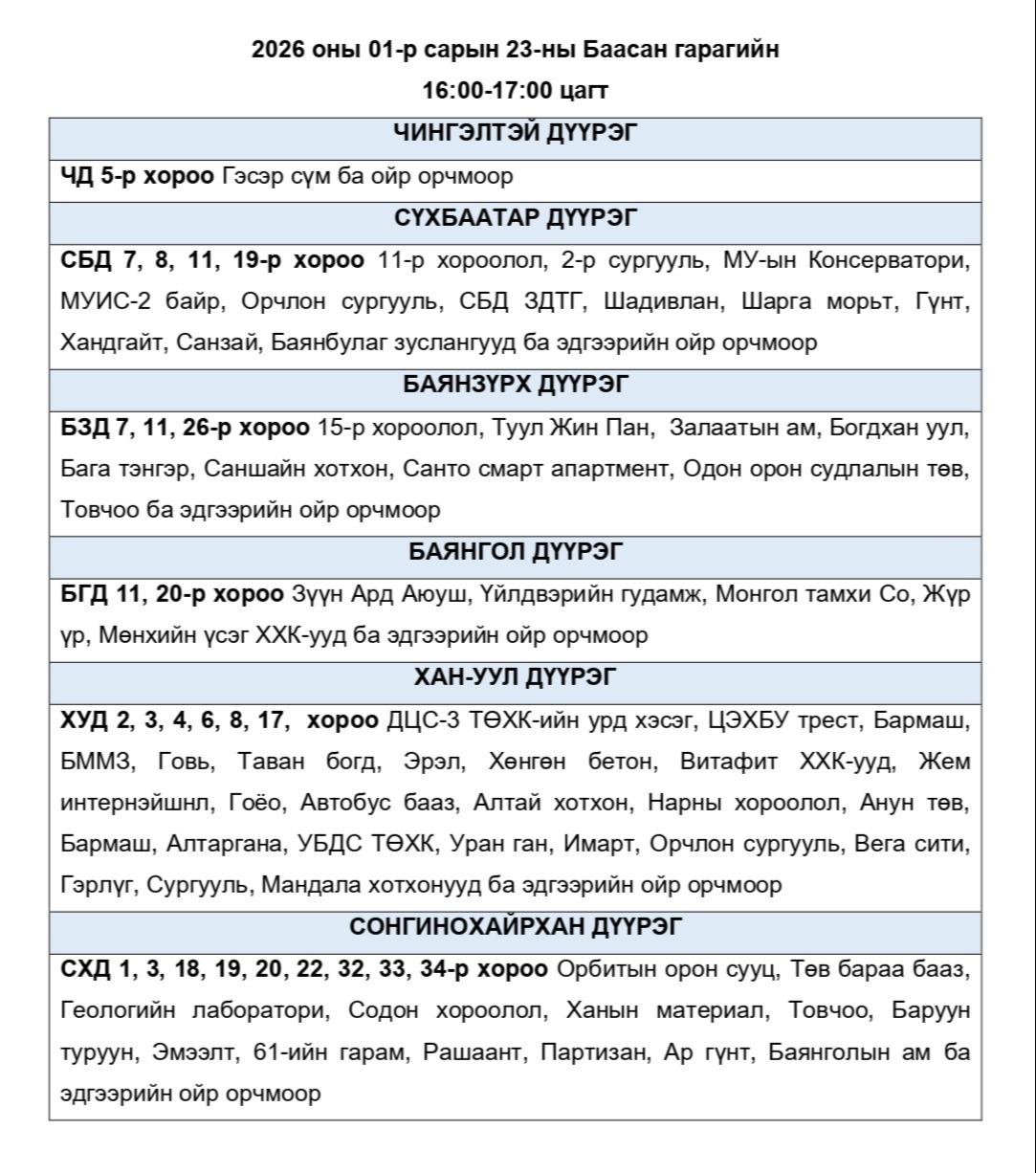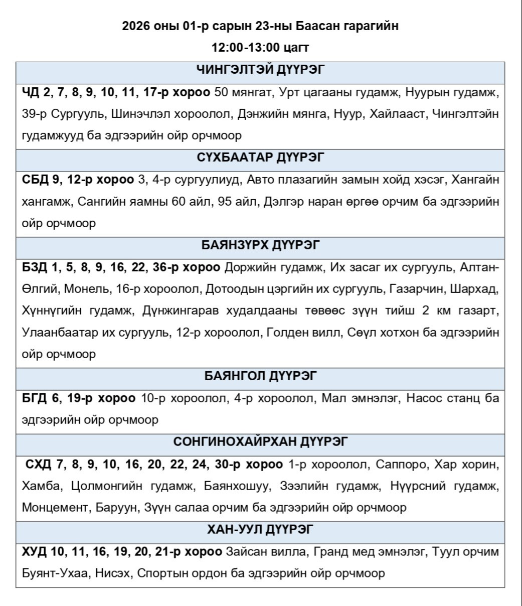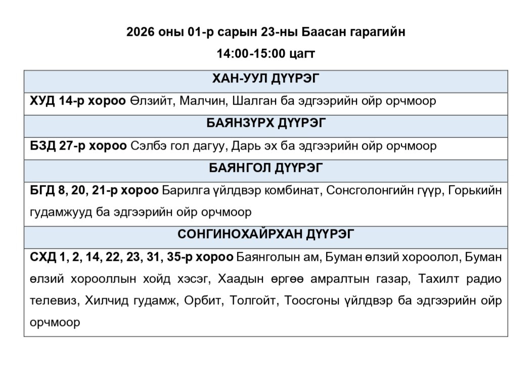 Дулааны IV цахилгаан станцын зуухны халах гадаргууд 2026 оны нэгдүгээр сарын 20-ны өдрийн 16:00 цагт гэмтэл гарч, айл өрхийн цахилгааныг хязгаарлаж эхэлсэн. Энэ хүрээнд эрчим хүчний чадлын дутагдлаас шалтгаалан өнөөдөр /2026.01.23/ цахилгаан эрчим хүчний хязгаарлалт хийж болзошгүй байршлуудын хуваарийг танилцуулж байна. Эрчим хүчний системд аваарын горим үүсэхээс сэргийлэн нийслэлийн хэмжээнд тодорхой байршлуудад цахилгаан эрчим хүчний төлөвлөсөн хэрэглээг “Диспетчерийн үндэсний төв” ТӨХХК-ийн шийдвэрээр хуваарийн дагуу 1:30 цагийн хугацаатайгаар хязгаарлах арга хэмжээ авч байна.