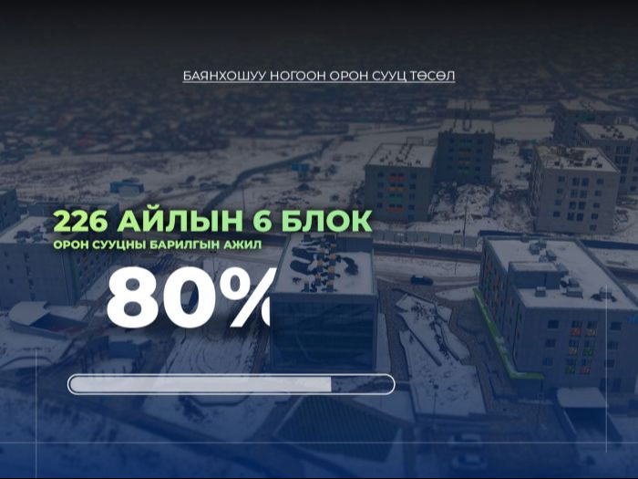 Баянхошуунд барьж буй 226 айлын орон сууцны барилга угсралтын явц 80 орчим хувьтай байна