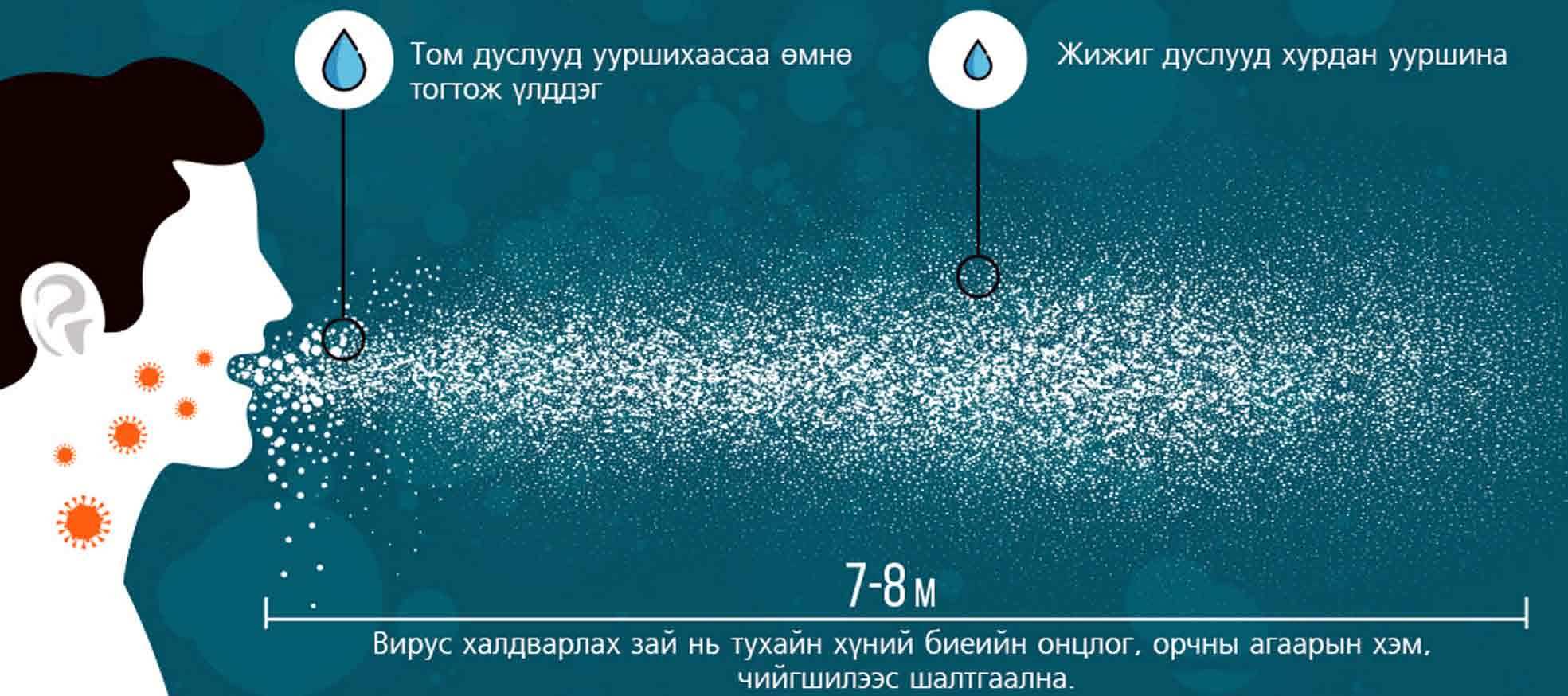 ДЭМБ-аас нотолгоонд үндэслэн энэхүү вирус агаар дуслын замаар хурдацтай халдварлаж буйг сануулж, амны хаалт зүүж, гараа тогтмол угааж, олон нийтийн газраар явалгүй аль болох гэртээ байхыг сануулсаар байгаа билээ. Амьсгалын замын ямар нэгэн өвчний шинж тэмдэгтэй хүнд нэг метр буюу гурван футын зайтай ойртоход л халдвар авах эрсдэлтэй.