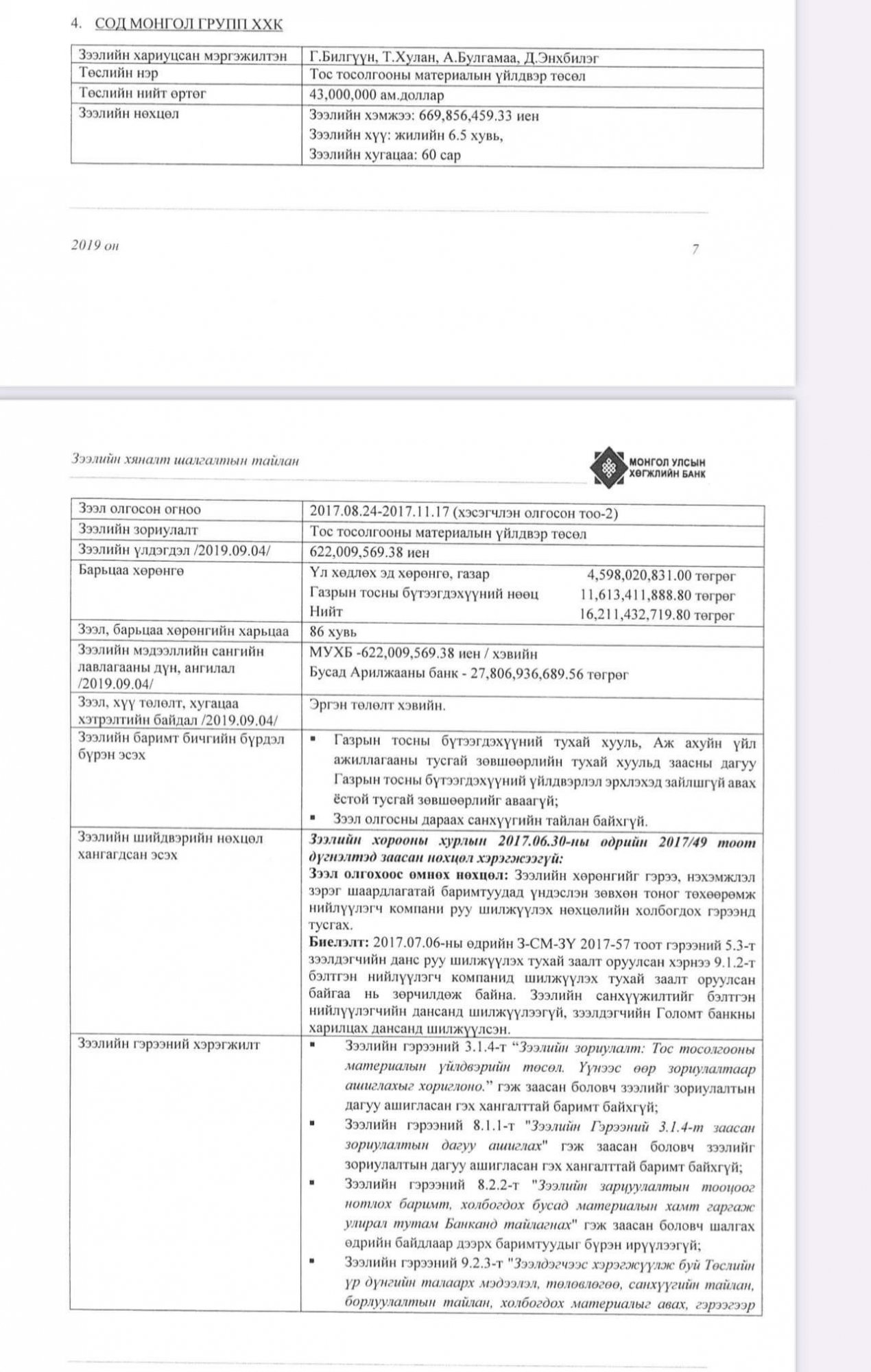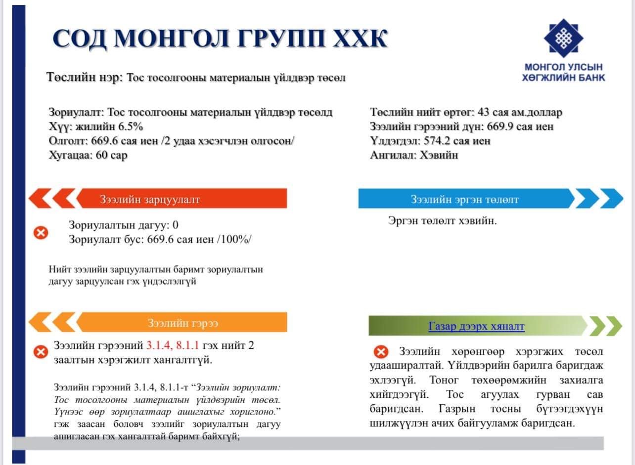 Харин одоо ээлжит баримтаа дэлгэе. Эх сурвалж нь Хөгжлийн банкны Зээлийн хяналт шалгалтын тайлан. УИХ-ын гишүүн Ц.Анандбазарын эзэмшлийн “Сод монгол групп” ХХК “Тос тосолгооны материалын үйлдвэр” төсөл гэсэн нэртэйгээр, жилийн 6.5 хувийн хүүтэй 60 сарын хугацаатайгаар 669.6 сая иенийн дүнтэй хоёр удаагийн хэсэгчилсэн зээлийг авсан. Төслийн нийт өртөг нь 43 сая ам.доллар! Хөгжлийн банкны зээлийн хяналт шалгалтаар зээлийн гэрээний 3.1.4 болон 8.1.1 гэх нийт хоёр заалтын хэрэгжилт хангалтгүй гэж дүгнэгджээ. Дээрх заалтад “Зээлийн гэрээний зориулалт: Тос тосолгооны материалын үйлдвэрийн төсөл. Үүнээс өөр зориулалтаар ашиглахыг хориглоно” гэж заасан боловч зээлийг зориулалтын дагуу ашигласан гэх хангалттай баримт байхгүй хэмээн тайланд дүгнэсэн байгаа юм. Мөн үүнд “2017 оны 7 дугаар сарын 6-ны өдрийн З-СМ-ЗҮ 2017057 тоот гэрээний 5.3-т зээлдэгчийн данс руу шилжүүлэх тухай заалт оруулсан хэрнээ 9.1.2-т бэлтгэн нийлүүлэгч компанид шилжүүлэх тухай заалт оруулсан байгаа нь зөрчилдөж байна. Зээлийн санхүүжилтийг бэлтгэн нийлүүлэгчийн дансанд шилжүүлээгүй, зээлдэгчийн “Голомт” банкны дансанд шилжүүлсэн” гэж Хөгжлийн банкны зээлийн хяналт шалгалтын тайланд бичсэн байна. Түүнчлэн Хөгжлийн банкнаас зээлдэгчийн төлөөлөлтэй тухай төслийн байршилд очиж уулзах үеэр өгсөн тайлбар нь “2021 оны хоёрдугаар улирлаас үйлдвэрлэлийг эхлүүлнэ” гэсэн мэдээлэл өгчээ. Өнөөдрийн байдлаар ямар үйлдвэрлэл эхэлчихээд байгаа юм бэ?