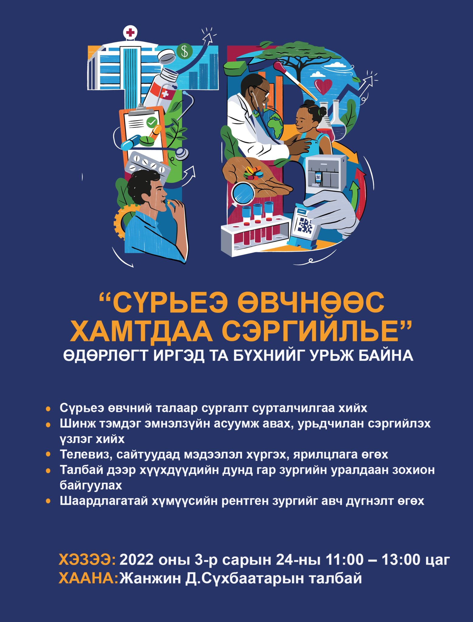 Дэлхийн эрүүл мэндийн байгууллага /ДЭМБ/-аас жил бүрийн гуравдугаар сарын 24-нийг “Сүрьеэтэй тэмцэх дэлхийн өдөр" болгон зарласан. 2022 онд тус өдрийг “Сүрьеэгүй ирээдүйн төлөө хөрөнгө оруулалтыг нэмэгдүүлье” уриан дор тэмдэглэн өнгөрүүлэх гэж байна. Энэ хүрээнд ХӨСҮТ, НЗДТГ, НЭМГ, НЭМҮТ, дүүргийн эрүүл мэндийн төвийн сүрьеэгийн диспансерийн хамт олон болон төрийн бус байгууллагууд хамтран маргааш Сүхбаатарын талбайд нээлттэй өдөрлөгийг 11.00-13.00 цагийн хооронд зохион байгуулна. Энэ үеэр сүрьеэ өвчний талаар сургалт, сурталчилгаа хийхээс гадна эмнэл зүйн асуумж авч, урьдчилан сэргийлэх үзлэг хийж, шаардлагатай хүмүүсийн рентген зургийг авах юм. Мөн хүүхдүүдийн дунд гар зургийн уралдаан зохион байгуулна.