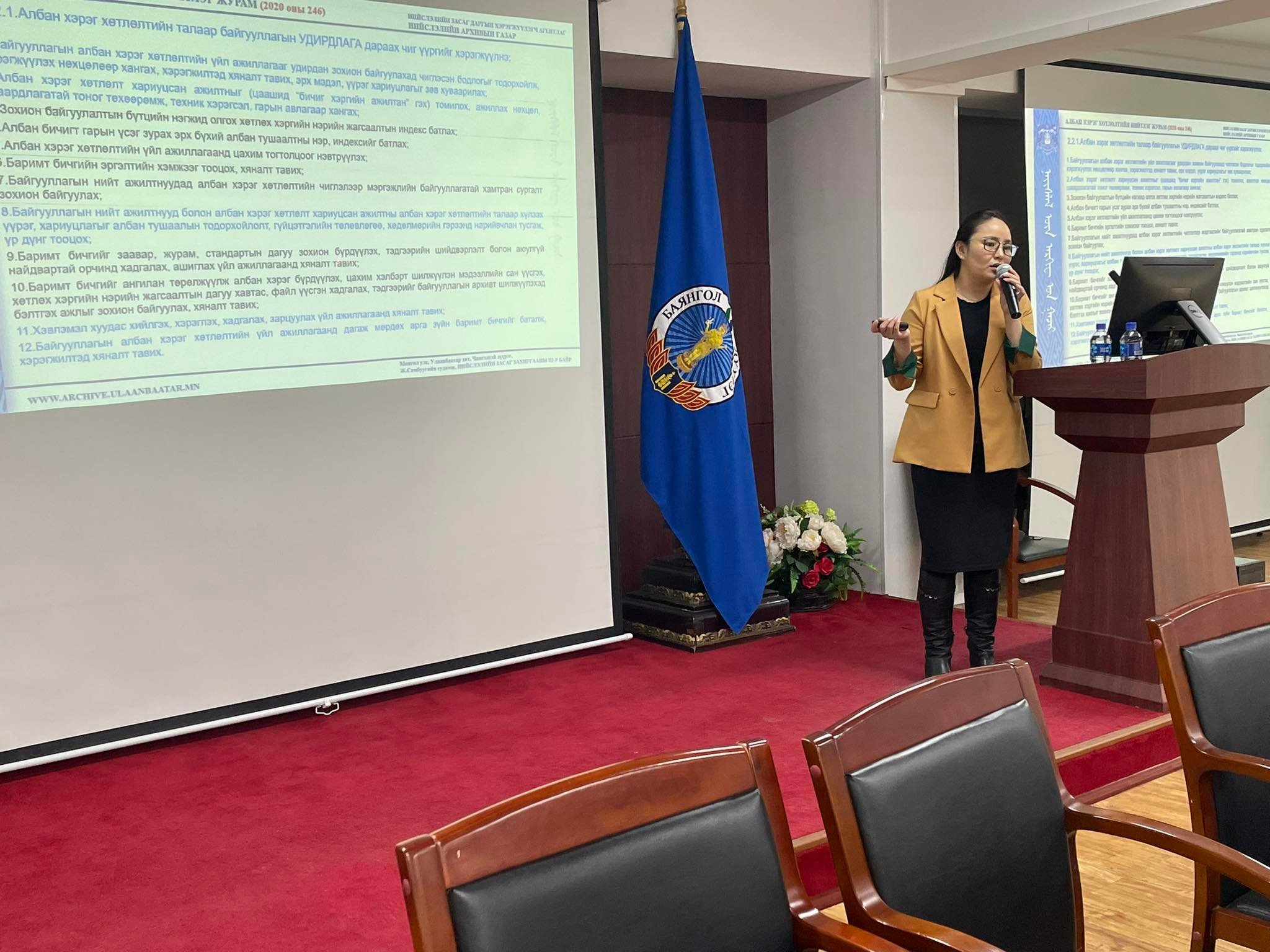 Үүнд, “Албан хэрэг хөтлөлтийн нийтлэг журам”-ын хэрэгжилтийг хангуулахад удирдах албан тушаалтны анхаарах асуудал, баримт боловсруулан тоон гарын үсгээр баталгаажуулан илгээх, “EDос” системийн ашиглалтад удирдлагуудын анхаарвал зохих асуудал, баримт бичгийн стандарт MNS 5140-1,2,3:2021, “Байгууллагын архивын үйл ажиллагааны нийтлэг журам”-ын хэрэгжилт, байгууллагын архивын “Баримт нягтлан шалгах комисс”-ын үйл ажиллагаа зэрэг сэдвийн хүрээнд мэдлэг, мэдээлэл олголоо.