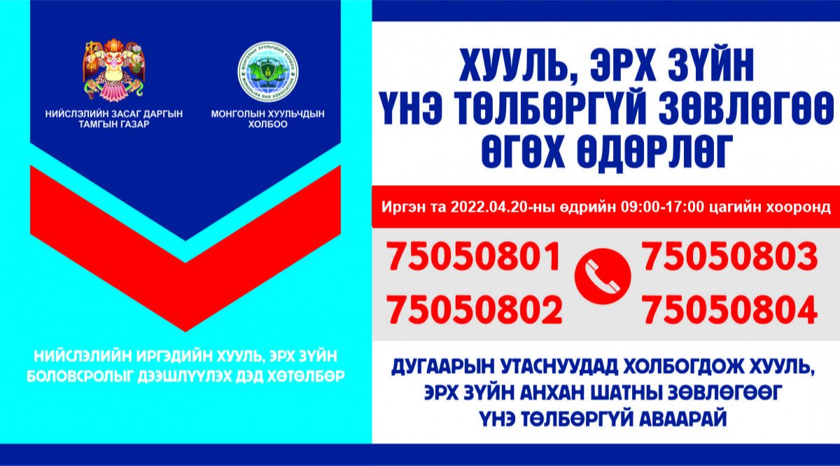 Энэ сарын өдөрлөгийг маргааш буюу дөрөвдүгээр сарын 20-нд 09:00-17:00 цагийн хооронд зохион байгуулах юм. Иймд иргэн та 75050801, 75050802, 75050803, 75050804 дугаарын утсаар холбогдож өөрт хэрэгтэй хууль, эрх зүйн зөвлөгөө, мэдээллийг авах боломжтой.