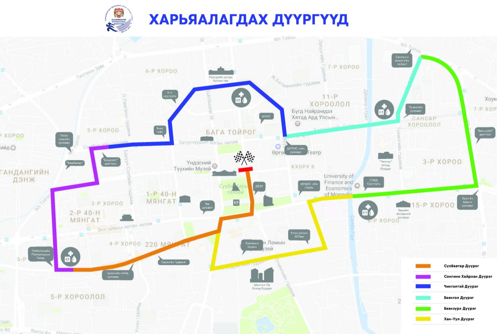 10.000 м: /ГАРАА/ - Д.Сүхбаатарын талбай-Төв шуудан - Сөүлийн гудамж - "Норе" шүдний эмнэлэг - Бишрэлт дэлгүүр - Зоос гоёл - V сургууль - Хүүхдийн урлан бүтээх төв - МУИС - ШУТИС-ийн уулзвар - Чингис Зочид буудал - Сансарын туннел /Сансарын туслах зам/ - Баянцээл дэлгүүр - Зүүн 4-н замын уулзвар - Бөхийн өргөө - СЭЗДС - МУБИС - Элчингийн гудамж - ДБЭТ – Д.Сүхбаатарын талбай /БАРИА/
