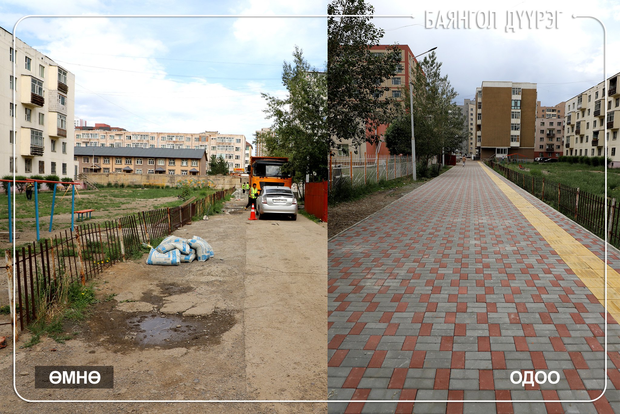 Баянгол дүүргийн 5, 6 дугаар хороо буюу 10 дугаар хорооллын зарим байрны орчимд явган хүний замгүй, үүнээс болж бороо орсон үед ус ихээр тогтож, иргэдэд хүндрэл учруулдаг байсан юм. Үүнтэй холбоотойгоор иргэд оршин суугчдаас ус их тогтдог газарт явган хүний замтай болгож өгөх хүсэлтийг удаа дараа ирүүлж байсан удаатай. Тэгвэл иргэдийнхээ ирүүлсэн санал, хүсэлтийн хүрээнд энэ онд дүүргийн төсвийн хөрөнгө оруулалтаар 5, 6 дугаар хороонд дөрвөн байршилд явган хүний зам тавиад байна. Тухайлбал,