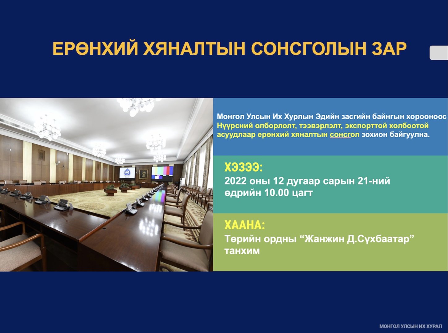 Бүртгэл: Ерөнхий хяналтын сонсголын бүртгэлийн ажиллагаа 2022 оны 12 дугаар сарын 20-ны өдрийн 17.30 цаг хүртэл явагдана.