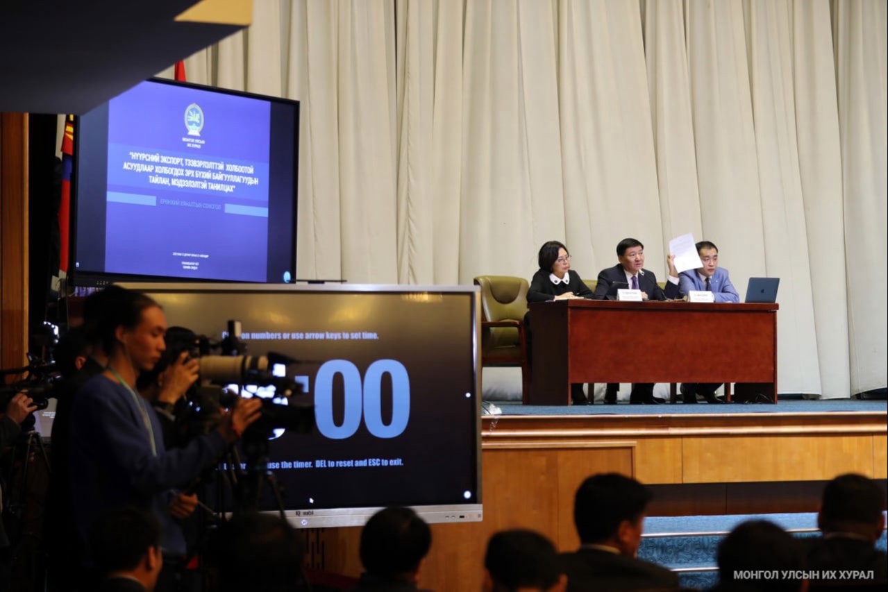 Улсын Их Хурлын Эдийн засгийн байнгын хорооноос зохион байгуулж буй “Нүүрсний экспорт, тээвэрлэлттэй холбоотой асуудлаар холбогдох эрх бүхий байгууллагуудын тайлан, мэдээлэлтэй танилцах” ерөнхий хяналтын сонсгол үргэлжилж байна. Ерөнхий хяналтын сонсгол бол Улсын Их Хурлын хянан шалгах бүрэн эрхээ хэрэгжүүлэх арга хэрэгслүүдийн нэг юм. Улсын Их Хурлаас Агаарын бохирдлын асуудлаар, мөн Хөгжлийн банкны асуудлаар ерөнхий хяналтын сонсголыг өмнө нь зохион байгуулж байсан бол одоо “Нүүрсний экспорт, тээвэрлэлттэй холбоотой асуудлаар холбогдох эрх бүхий байгууллагуудын тайлан, мэдээлэлтэй танилцах” ерөнхий хяналтын сонсголыг зохион байгуулж байна.