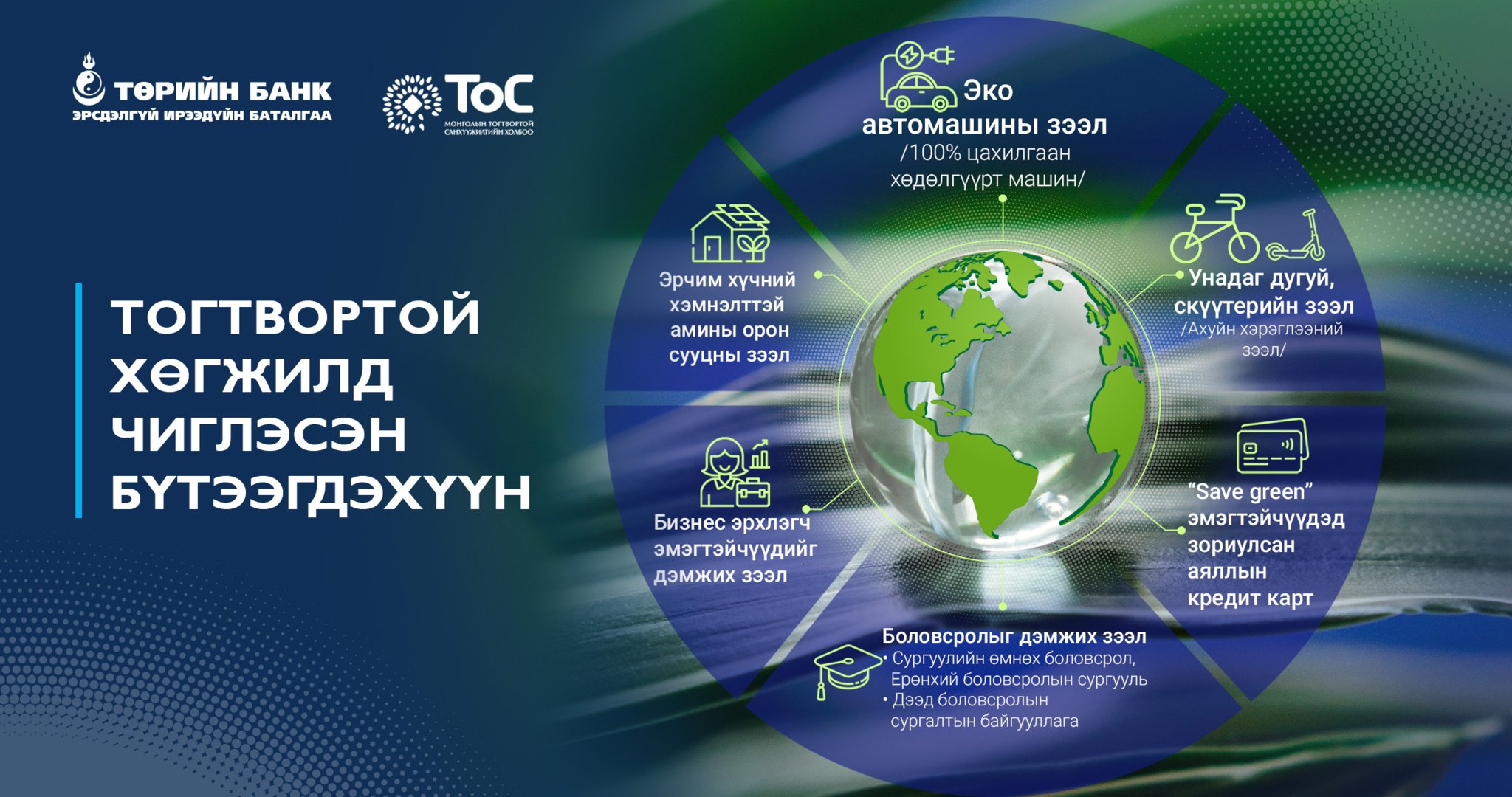 Эрчим хүчний хэмнэлттэй амины орон сууцны зээл, эко автомашины зээл, унадаг дугуй скүүтэрийн зээл, бизнес эрхлэгч эмэгтэйчүүдийг дэмжих зээл болон боловсролыг дэмжих зээлүүдийг зах зээлд гаргаад байна. Өөрсдийн амьдарч буй орчин, улс эх орноо хамгаалахад иргэн бүрийн үүрэг оролцоо маш чухал.