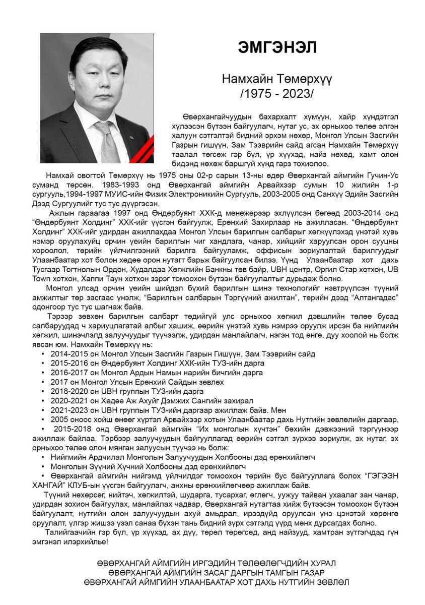 Өвөрхангайчуудын бахархалт хүмүүн, хайр хүндэтгэл хүлээсэн бүтээн байгуулагч, нутаг ус, эх орныхоо төлөө элгэн халуун сэтгэлтэй бидний эрхэм нөхөр, Монгол Улсын Засгийн Газрын гишүүн, Зам Тээврийн сайд агсан Намхайн Төмөрхүү таалал төгсөж гэр бүл, үр хүүхэд, найз нөхөд, хамт олон бидэнд нөхөж баршгүй хүнд гарз тохиолоо.
