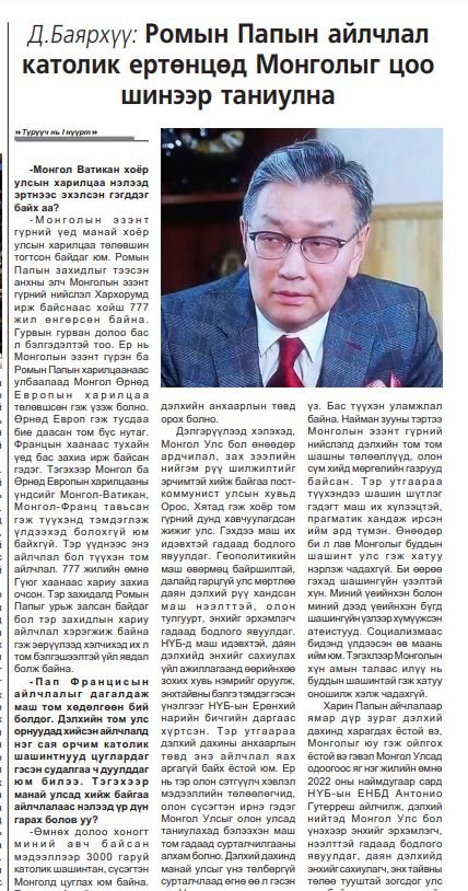 -Сөрөг үр дагавар тохионо гэж огт бодохгүй байна. Даяаршлын эрин үед, хөгжлийн хурдны, мэдээллийн технологи асар их хурдтай хөгжиж байгаа энэ эрин үед Монголд сөрөг нөлөө учирна, ирээдүйд эрсдэл тохионо гэдэг ойлголт угаасаа байж таарахгүй. Монгол Улс шашны эрх чөлөөг баталгаатай хангаж чадсан улс. Бидний сонгож авсан ардчилал, хүний эрх, эрх чөлөөг дээдэлсэн, олон шашныг хүндэтгэж ирсэн энэ тогтолцоог аваад үз. Бас түүхэн уламжлал байна. Найман зууны тэртээ Монголын эзэнт гүрний нийслэлд дэлхийн том том шашны төлөөллүүд, олон сүм хийд мөргөлийн газрууд зэрэгцээд байсан. Тэр утгаараа түүхэндээ шашин шүтлэг гэдэгт маш их хүлээцтэй, прагматик хандаж ирсэн ийм ард түмэн. Өнөөдөр би л лав Монголыг буддын шашинт улс гэж хатуу нэрлэж чадахгүй. Би өөрөө гэхэд шашингүйн үзэлтэй хүн. Миний үеийнхэн болон миний дээд үеийнхэн бүгд шашингүйн эзлээр хүмүүжсэн атеистууд. Социализмаас бидэнд үлдээсэн өв маань ийм юм. Тэгэхлээр Монголын хүн амын талаас илүү нь буддын шашинтай гэж хатуу оношилж хэлж чадахгүй. Харин Папын айчлалаар ямар дүр зураг дэлхий дахинд харагдах ёстой вэ, Монголыг юу гэж ойлгох ёстой вэ гэвэл Монгол Улсад одоогоос яг нэг жилийн өмнө 2022 оны наймдугаар сард НҮБ-ын ЕНБД Антонио Гутерреш айлчилж, дэлхий нийтэд Монгол Улс бол үнэхээр энхийг эрхэмлэгч, нээлттэй гадаад бодлого явуулдаг, даян дэлхийд энхийг сахиулагч, энх тайвны төлөө тууштай зогсдог улс юм байна гэдэг мессэжийг хүн төрөлхтөнд өгсөн. Үүнийг Антонио Гутерреш өөрөө нотлоод, “Монгол бол энх тайвны бэлгэ тэмдэг” хэмээн зарласан. Энэ удаа яг жилийн дараа Ромын Пап айлчилж байна гэдэг Монгол Улс бол оюун санаа, шашин шүтлэгийн эрх чөлөөний бэлгэ тэмдэг болсон улс юм байна гэдэг мессэжийг дэлхий дахин түгээнэ гэдэгт итгэлтэй байна. Үр дагавар гэж асуусантай чинь холбогдуулан тэмдэглэж хэлэхэд Гэгээн ширээт улсын Төрийн тэргүүний энэ удаагийн айлчлал бол Монголын түүхнээ, тэр дундаа гадаад бодлогын түүхнээ тод үсгээр тэмдэглэгдэн үлдэнэ. Монгол Улсын олон тулгуурт, тэнцвэртэй, гуравдагч хөршийг эрхэмлэсэн гадаад бодлого маань шинэ агуулгаар баяжина. Монгол дахь шашны аялал жуулчлалын торгон эхлэл болно. Манай улсын олон улсын нэр хүндийг шинэ шатанд гаргана гэж үзэж байна. Төгсгөлд нь тэмдэглэж хэлэхэд Монгол-Гэгээн ширээт улсын харилцааны түүхэнд энэ 2023 онд маш онцлогтой, маш тодоор бичигдэх үйл явдлаар баялаг он болно. Учир нь өнгөрсөн хавар Гэгээн ширээт улсын Гадаад харилцааны асуудал эрхэлсэн Нарийн бичгийн дарга тэргүүн хамба Пол Ричард Галлагер манай улсад айлчилсан, залгуулаад Төрийн тэргүүн нь айлчилж байна. Үүнийг түүхэн, онцлог үйл явдал гэж нэрлэхээс өөр юу гэх билээ.