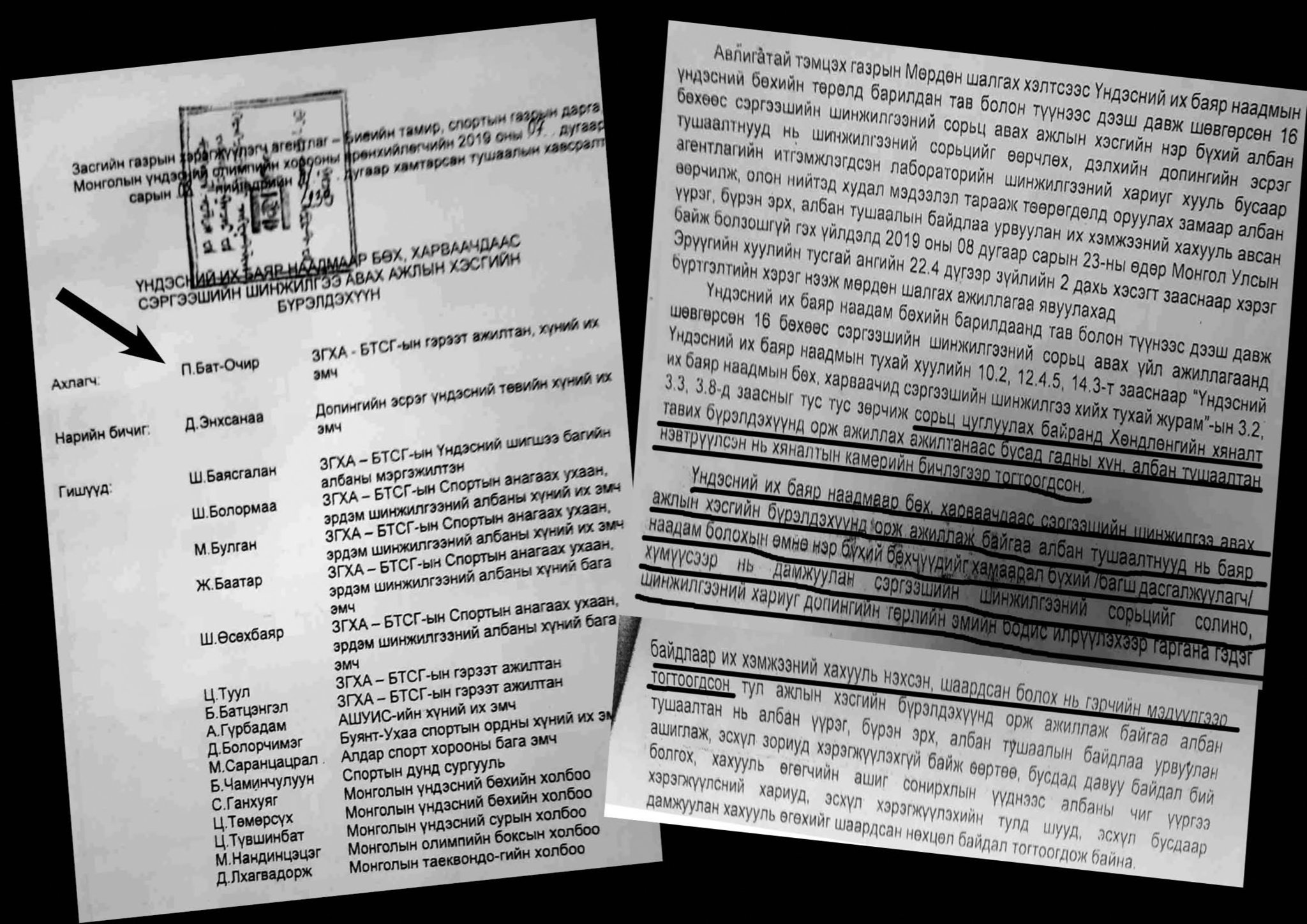 “АТГ-ын Мөрдөн шалгах хэлтсээс Үндэсний их баяр наадмын үндэсний бөхийн төрөлд барилдан тав болон түүнээс дээш давж шөвгөрсөн 16 бөхөөс сэргээшийн шинжилгээний сорьц авах Ажлын хэсгийн нэр бүхий албан тушаалтнууд нь шинжилгээний сорьцыг өөрчлөх, Дэлхийн допингийн эсрэг агентлагийн итгэмжлэгдсэн лабораторийн шинжилгээний хариуг хулуь бусаар өөрчилж, олон нийтэд худал мэдээлэл тарааж, төөрөгдөлд оруулах замаар албан үүрэг, бүрэн эрх, албан тушаалын байдлаа урвуулан их хэмжээний хахууль авсан байж болзошгүй гэх үйлдэлд 2019 оны наймдугаар сарын 23-ны өдөр Монгол Улсын Эрүүгийн хуулийн тусгай ангийн 22.4 дүгээр зүйлийн 2 дахь хэсэгт зааснаар хэрэг бүртгэлтийн хэрэг нээж мөрдөн шалгах ажиллагаа явуулахад, Үндэсний их баяр наадмын бөхийн барилдааны тав болон түүнээс дээш давж шөвгөрсөн 16 бөхөөс сэргээшийн шинжилгээний сорьц авах үйл ажиллагаанд Үндэсний их баяр наадмын тухай хуулийн 10.2, 12.4.5, 14.3-т зааснаар “Үндэсний их баяр наадмын бөх, харваачид сэргээшийн шинжилгээ хийх тухай журам”-ын 3.2, 3.3, 3.8-д заасныг тус тус зөрчиж, сорьц цуглуулах байранд Хөндлөнгийн хяналт тавих бүрэлдэхүүнд орж ажиллах ажилтнаас бусад гаднын хүн, албан тушаалтан нэвтрүүлсэн нь хяналтын камерын бичлэгээр тогтоогдсон. Үндэсний их баяр наадмаар бөх, харваачдаас сэргээшийн шинжилгээ авах Ажлын хэсгийн бүрэлдэхүүнд орж ажиллаж байгаа албан тушаалтнууд нь баяр наадам болохын өмнө нэр бүхий бөхчүүдийг хамаарал хүмүүс бүхий буюу багш, дасгалжуулагчдаар нь дамжуулан “Сэргээшийн шинжилгээний сорьцыг солино. Шинжилгээний хариуг допингийн төрлийн эмийн бодис илрүүлэхээр гаргана” гэдэг байдлаар их хэмжээний хахууль нэхсэн, шаардсан болох нь гэрчийн мэдүүлгээр тогтоогдсон. Тиймээс Ажлын хэсгийн бүрэлдэхүүнд орж ажиллаж байга албан тушаалтан нь албан үүрэг, бүрэн эрх, албан тушаалын байдлаа урвуулан ашиглаж, эсхүл зориуд хэрэгжүүлэхгүй байж өөртөө, бусдад давуу байдал бий болгох, хахууль өгөгчийн ашиг сонирхлын үүднээс албаны чиг үүргээ хэрэгжүүлсний хариуд, эсхүл хэрэгжүүлэхийн тулд шууд, эсхүл бусдаар дамжуулан хахууль өгөхийг шаардсан нөхцөл байдлаар тогтоогдож байна” гэжээ. Эндээс харвал, 2019 оны Үндэсний их баяр наадам болохоос гуравхан хоногийн өмнө байгуулагдсан одоогийн БТСУХ-ны энэ Ажлын хэсэг тухайн жилийн баяр наадмаар бөхчүүдийг янз бүрээр дарамталж, авлига нэхсэн нь АТГ-ын энэ мөрдөн шалгалтаар тогтоогджээ. Тэр жилийн наадмаар хэн хэн гэдэг бөхчүүд допингтой гарсан билээ дээ. Тэдний дүн асуудалтай байж болзошгүй л юм байна.
