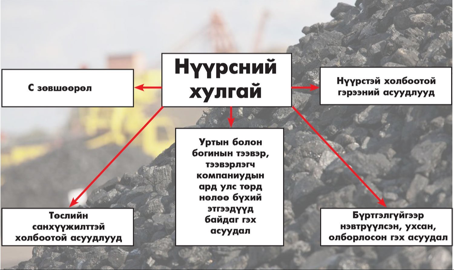 Арав гаруй жил үргэлжилсэн нүүрсний хулгай өнгөрсөн жилийн өдийд л төрийн ч, иргэдийн ч анхааралд орж ирсэн. Маш их хэмжээний мөнгөний “сан”-тай далд эдийн засаг байжээ. Нүүрсний хулгайн ганц нэгхэн “салбар” зогсоход л мэдрэгдэж байх жишээтэй. Тэндээс “...2023 оны төсөвт хоёр их наяд нэмэгдсэн” гэхээр зах зухаасаа ойлгогдож байгаа юм. АТГ-аас нүүрсний хулгайн хэргийг таван үндсэн чиглэлээр шалгаж байгаагаа жилийн өмнө мэдээлж байв. Тэдгээрт нь “...Бүртгэлгүйгээр нэвтрүүлсэн, ухсан, олборлосон гэх асуудал”, “...Нүүрстэй холбоотой гэрээний асуудлууд”, “...Уртын болон богинын тээвэр, тээвэрлэгч компаниудын ард улс төрд нөлөө бүхий этгээдүүд байдаг гэх асуудал”, “...С зөвшөөрөл”, “...Төслийн санхүүжилт холбоотой асуудлууд” багтсан байгаа юм.