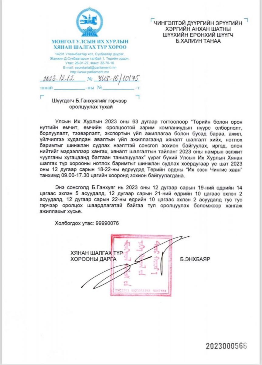 Нүүрсний хэргийг хянан шалгах түр хорооноос зарлаж буй хоёр дахь сонсгол ирэх даваа гарагт эхэлнэ. Энэ удаагийн сонсголд 268 гэрчийг оролцуулахаар дуудаж байгаагаа Хянан шалгах түр хорооны дарга, ХЗДХ-ийн сайд Б.Энхбаяр танилцуулсан. Эдгээрийн дунд "Эрдэнэс Тавантолгой" ХК-ийн гүйцэтгэх захирал асан Б.Ганхуягийн нэр багтсан байдаг. Тэгвэл Түр хорооноос Чингэлтэй дүүргийн Эрүүгийн хэргийн анхан шатны шүүхэд Б.Ганхуягийг сонсголд оролцуулах тухай хүсэлтийг хүргүүлжээ.