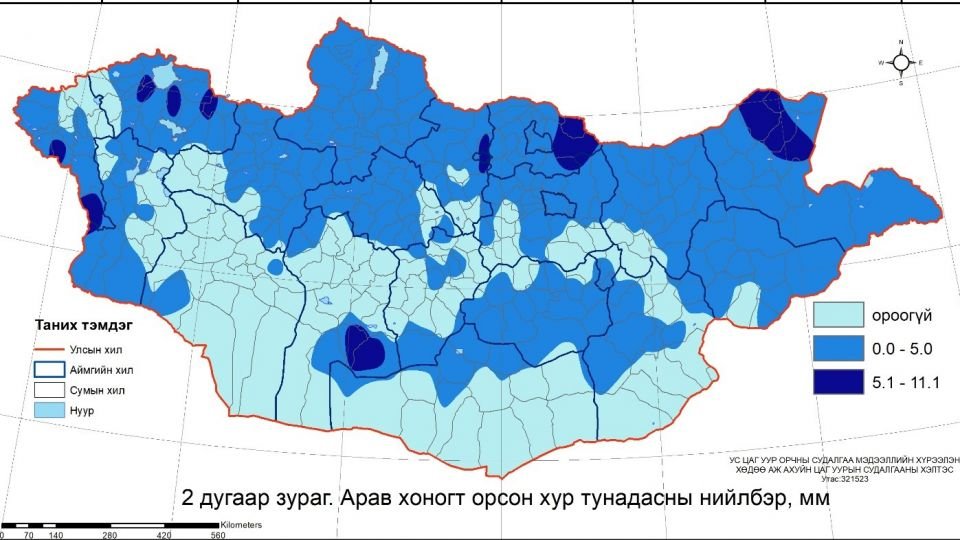 Төвийн ихэнх, Говь-Алтай, Завхан, Архангай, Өвөрхангай, Хөвсгөл, Булган, Орхон, Сэлэнгэ, Дархан-Уул, Хэнтий, Дорнодын зарим, Баян-Өлгий, Увс, Дорноговь, Сүхбаатарын ганц нэг сумдын нутгаар 5,1-10 см, бусад нутагт 1-5 см (3 дугаар зураг), хунгарлаж шуурсан газартаа 60 см хүртэл зузаан цастай байна.