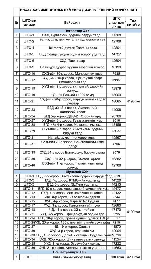 Иймд та бүхэн БНХАУ-аас импортолсон, сайн чанарын Евро5 ангиллын дизель түлшийг дараах ШТС-уудаас оочер дараалалгүй худалдан авах боломжтой юм хэмээн АМГТГ-аас мэдээллээ.