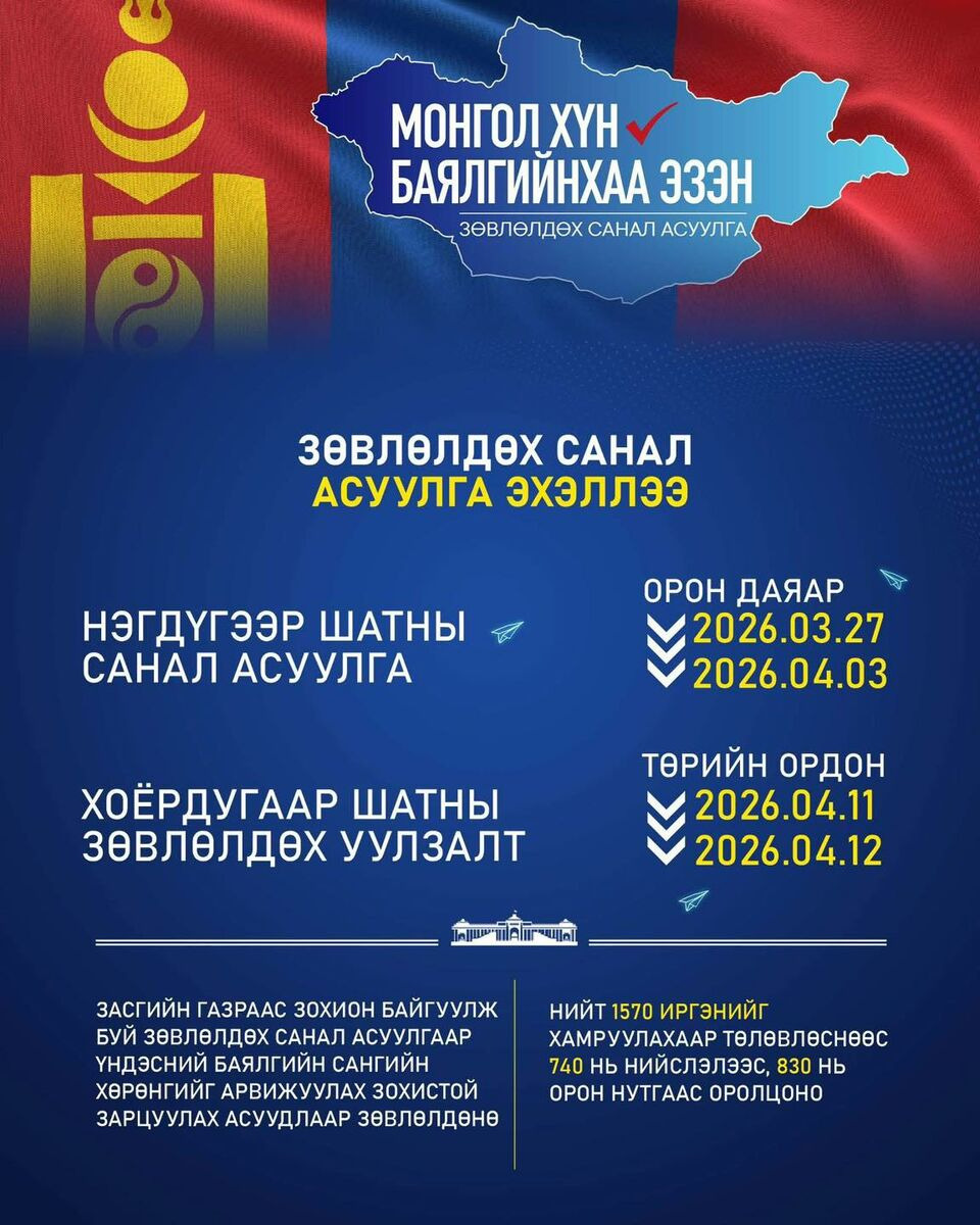 “Зөвлөлдөх санал асуулга явуулах тухай” Монгол Улсын Засгийн газрын 2026 оны 48 дугаар тогтоолоор газрын хэвлийн баялгийн өгөөжийг Үндэсний баялгийн санд төвлөрүүлж, одоо ба ирээдүйн үеийн иргэн бүрд тэгш, шударга хүртээх, Үндэсний баялгийн сангийн орлогыг нэмэгдүүлэх, хөрөнгийг арвижуулах, зүй зохистой зарцуулах асуудлаар иргэдтэй зөвлөлдөх санал асуулгыг зохион байгуулахаар шийдвэрлэсэн билээ.