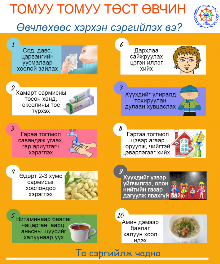 - Гэр, сургууль, цэцэрлэг, ажлын байрандаа цэвэр агаар оруулж, өдөрт чийгтэй цэвэрлэгээг 2-оос доошгүй удаа хийх зэрэг энгийн аргуудыг хэрэглэхээс гадна ТТТӨ-нөөс сэргийлэх үндсэн гол арга бол томуугийн эсрэг сайн дурын дархлаажуулалтанд хамрагдах явдал юм. Тиймээс та бүхэн ХӨСҮТ-ийн сайн дурын дархлаажуулалтын кабинетаар үйлчлүүлээрэй. Ялангуяа 2-15 хүртэлх насны хүүхэд, өндөр настан, уушгины архаг суурь өвчтэй хүмүүс хамрагдвал илүү ач холбогдолтой.