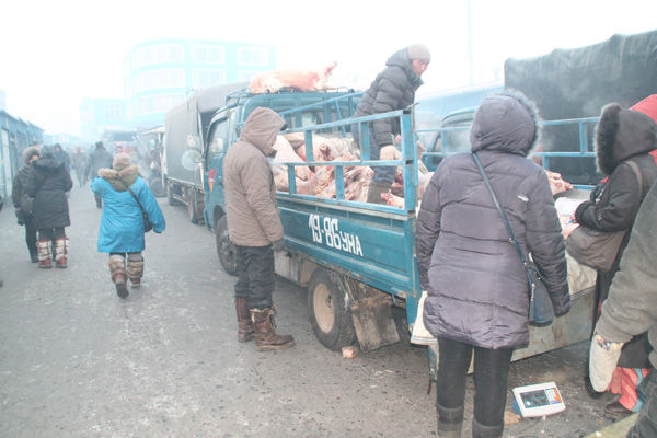 “Хүчит шонхор” худалдааны төвийн хашаанд портер, микро, бүр жижиг оврын Приус автомашины ачааны хэсэгт ч мах борлуулж байв. Хонь, ямааны гулууз, адуу, үхрийн өрөөл махыг ченжүүд болон малчид энд борлуулдаг аж. Тэднээс жижиглэнгээр худалдаа хийдэг хүмүүс худалдан авдаг байна. Хонины нэг гулууз мах хамгийн багадаа 16 кг байх бөгөөд том нь 25 кг хүрдэг байна. Тус захад бөөний үнээр нэг кг хонь, ямааны мах 2800-3200 төгрөгийн ханштай байлаа. Үүнийг өнгөрсөн хоёр жилийн мөн үеийнхтэй харьцуулахад 1000-1500 төгрөгөөр буурсан үзүүлэлт юм. Харин адуу, үхрийн мах гулуузаараа кг нь 3500-3800 төгрөгийн ханштай байв. Эндээс голдуу зоогийн газар, ресторан, супермаркетууд махыг бөөнөөр нь авахаас биш энгийн иргэд тэр бүр авдаггүй гэнэ. Иргэд голдуу жижиглэнгээр л авдаг юм байна. Тиймээс махны жижиглэнгийн үнэ хэд буйг сонирхлоо.