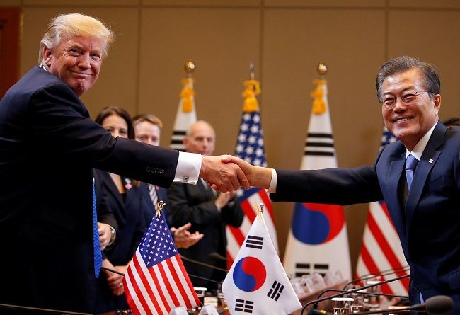 Хоёр улсын төрийн тэргүүнүүдийн дээд хэмжээний уулзалт Хөх ордонд болсон юм. БНСУ, АНУ-ын төрийн тэргүүнүүд уулзалтын дараа хэвлэл мэдээллийнхэнд зориулан бага хурал хийжээ. Талууд уулзалтынхаа үеэр Умард Солонгосын цөмийн хөтөлбөр, хоёр улсын харилцаа хамтын ажиллагаа, улс төр, нийгэм, эдийн засгийн түншлэл болоод бусад анхаарал татсан сэдвээр хэлэлцсэн байна. Хамтарсан хэвлэлийн бага хурал дээр Дональд Трамп “Вашингтон Умард Солонгосын зүгээс ирэх цөмийн зэвсгийн дарамт шахалтыг зүгээр хараад суухгүй. Пхеньян олон улсын шахалт шаардлагыг хүлээн авч цөмийн зэвсгийн туршилт болон Солонгосын хойгийн нутаг дэвсгэр дээр пуужингийн туршилт явуулж буйгаа таслан зогсоох ёстой” хэмээн хатуу мэдэгдлээ.
