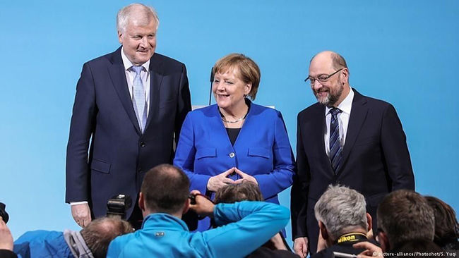 Их эвслийн намуудын дарга Х.Сээхофер, А.Меркел, М.Шульц нар. Хэлэлцээрийн эхний үр дүнг танилцуулах үеэр. 2018 оны 1 дүгээр сарын 12. Гэрэл зургийн dw.com сайтаас