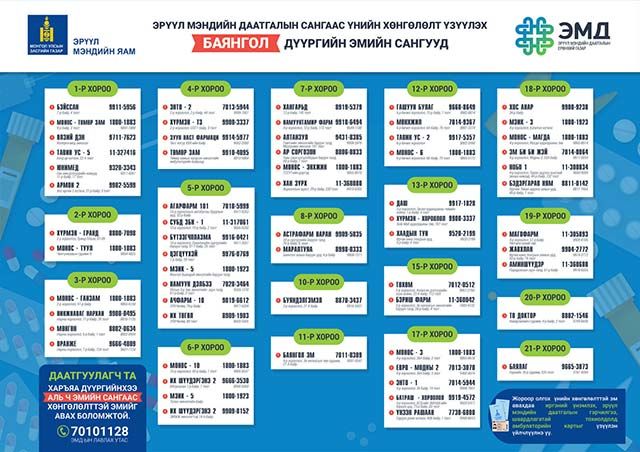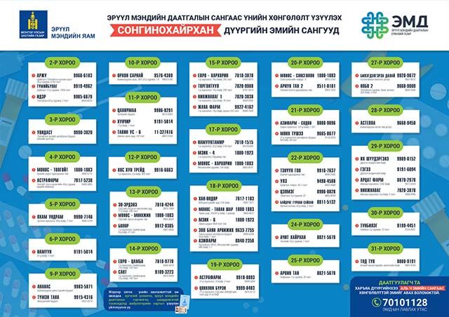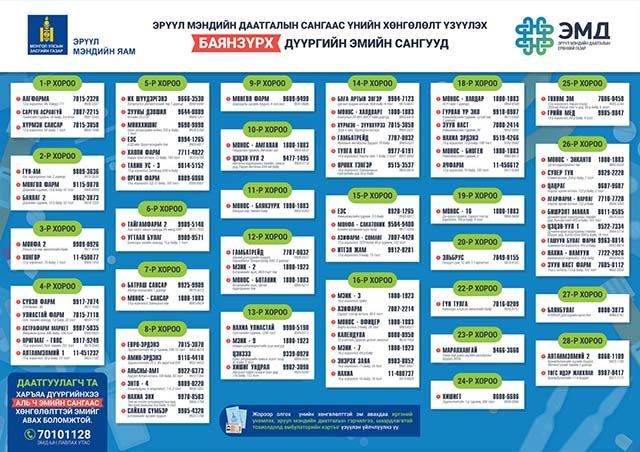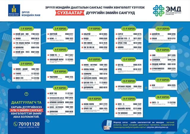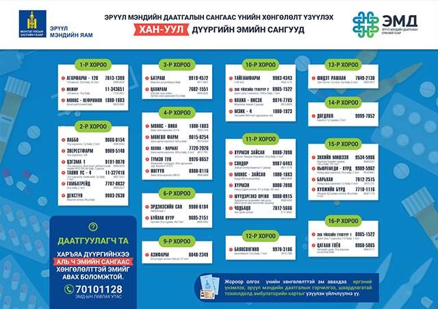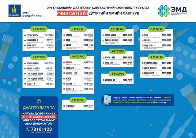 Нийслэлийн зургаан дүүрэгт Эрүүл мэндийн даатгалын сангаас хөнгөлөлттэй үнээр олгох эмээр үйлчлэх эмийн сангийн жагсаалтуудыг гаргажээ.