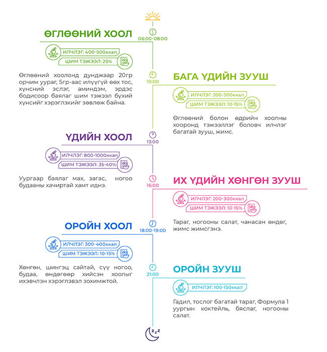 Эрүүл, зөв хооллолт гэдэг нь зөв хүнсийг сонгохоос эхлээд зөв цагт зөв хэмжээгээр тэнцвэртэй хооллох тухай ойлголт юм. Хүүхэд болон насанд хүрэгсэд өдөрт 5-6 удаа бага, багаар хооллох зарчмыг баримтлах нь хамгийн тохиромжтой гэж үздэг. Өөрөөр хэлбэл, өдөрт үндсэн 3 хоол, завсар хооронд нь 2-3 удаа жижиг зууш хэлбэрээр хооллох нь хоногийн тэнцвэртэй хооллолтын үндэс юм.