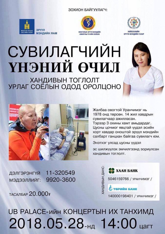 Эрүүл мэндийн салбарт хоёргүй сэтгэлээр зүтгэж, эгэл түмнийхээ энхийн манаанд чин үнэнчээр зогссон эмч, сувилагч нартаа урам хайрлаж, сувилагч Ж.Уранчимэгт туслах хандивын тоглолтод урлаг соёлын алдартнууд оролцохоор болжээ. “Сувилагчийн үнэний өчил” хандивын тоглолтын тасалбар 20 мянган төгрөгийн үнэтэй бөгөөд сувилагч Ж.Уранчимэгт амьдрал хайрлах сэтгэлийн хандивт нэгдэж, тусламжийн гараа сунгахын элэг нэгт Монголчууддаа уриалж байна.