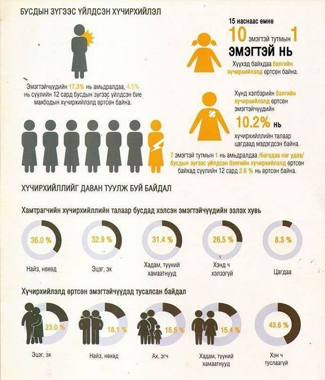 Монгол дахь НҮБ-ын Хүн амын сан, Үндэсний статистикийн хорооноос гаргасан “Хүчирхийллийн нүцгэн үнэн” судалгаагаар 15-64 насны гурван эмэгтэй тутмын хоёр нь хүчирхийлэлд өртөж байсан, үүний нэг хүрэхгүй хувь нь мэдээлэгддэг. Бэлгийн хүчирхийлэлд өртсөн эмэгтэйчүүдийн тэн хагас нь үр хөндүүлж байсан сэрдхийлгэм баримт байна. Өөрөөр хэлбэл, бие махбод, бэлгийн хүчирхийллийн хувьд Монгол Улс Ази номхон далайн бүсийн бусад орнуудтай харьцуулбал дунджаас дээгүүр түвшинд байгаа аж.