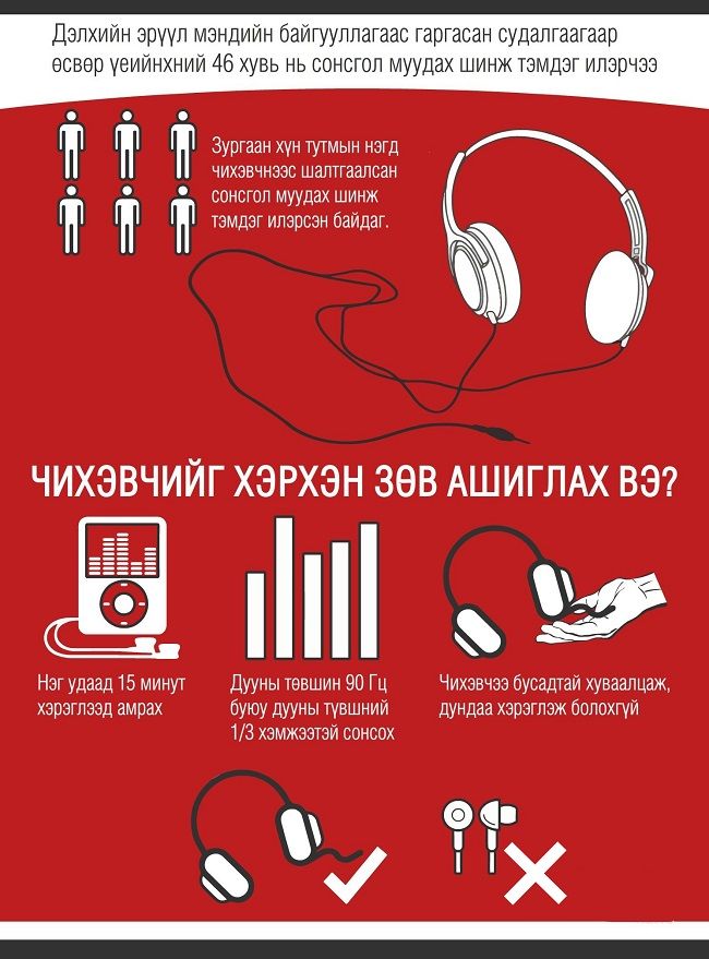 Дэлхийн эрүүл мэндийн байгууллагын судалгаанд өсвөр үеийнхний 46 хувь нь сонсгол муудах шинж тэмдэг илэрсэн гэжээ. Мөн зургаан хүн тутмын нэгд сонсгол муудах шинж тэмдэг илэрсэн байдаг аж. Олон улсын судалгаагаар өдөрт 50 хувиас чангагүй хөгжим болон яриаг 30 минут сонсоход хэвийн гэж үздэг. Үүнээс ихэдвэл сонсголд муугаар нөлөөлдөг.