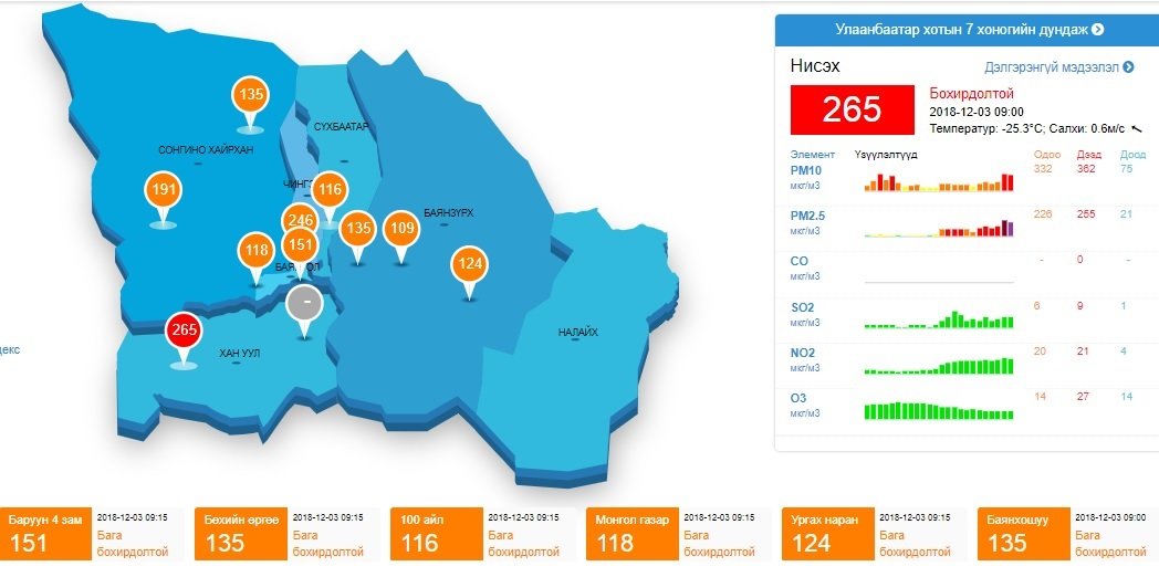 Өглөөний 09:00 цагийн байдлаар Баруун 4 зам, Бөхийн өргөө, Монгол газар, Ургах наран, Баянхошуу, Толгойт, МҮОНРТ, Нисэх орчимд агаар “Бага зэргийн бохирдолтой” байна. Тухайлбал, Нисэх орчимд АЧИ хамгийн өндөр буюу 235 байгаа бол Амгалан, 100 айл орчмын агаар хэвийн гарсан байна.