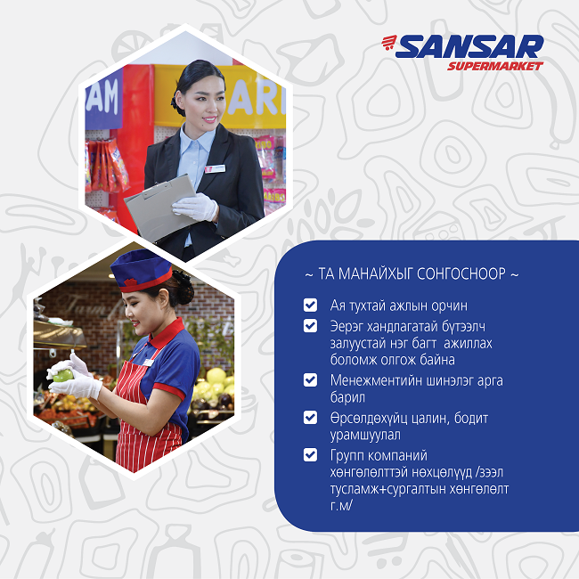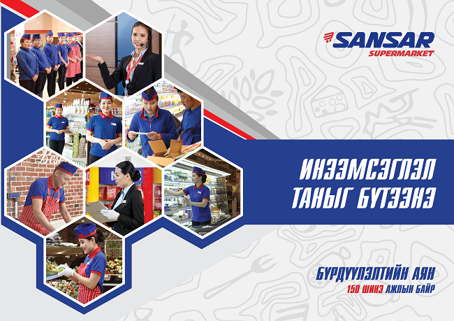 Сансар супермаркет нь бизнесээ өргөжүүлж, шинэ бүтээгдэхүүн үйлчилгээг хэрэглэгчиддээ хүргэх зорилгоор 150 шинэ орон тоог хөдөлмөрийн зах зээлд шинээр гаргаж байна.