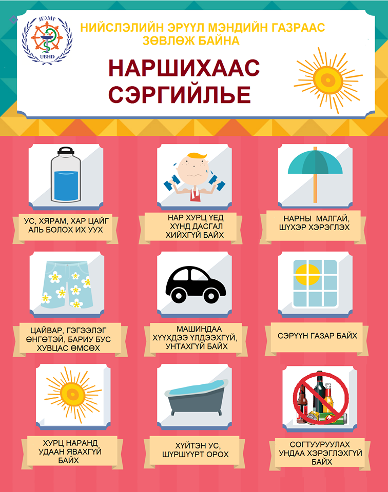 Ойрын өдрүүдэд ихэнх нутгаар өдөртөө 29-32 хэм хүртэл халах төлөвтэй байгаа тул ТА өөрийн болон гэр бүл, ойр дотны хүмүүсийнхээ эрүүл мэндэд санаа тавьж, наршихаас урьдчилан сэргийлэх арга хэмжээг аваарай.