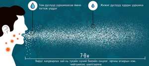 • Халдвартай хүн битүү орчинд найтаахад вирустэй дусал 7.9 метр хол цацагддагийг тогтоожээ