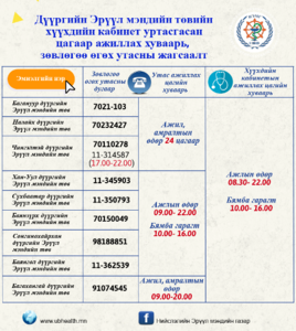 • Дүүргүүдийн эрүүл мэндийн төвийн “Хүүхдийн кабинет” уртасгасан цагаар ажиллаж, мэргэжлийн эмч утсаар зөвлөгөө өгч байна