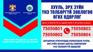 • Иргэдэд утсаар хууль, эрх зүйн үнэ төлбөргүй зөвлөгөө өгнө